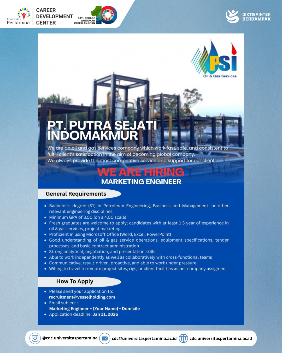 PT Putra Sejati Indomakmur (PSI Oil & Gas Services) membuka kesempatan bagi talenta terbaik untuk bergabung dan berkembang bersama kami di industri Oil & Gas.
