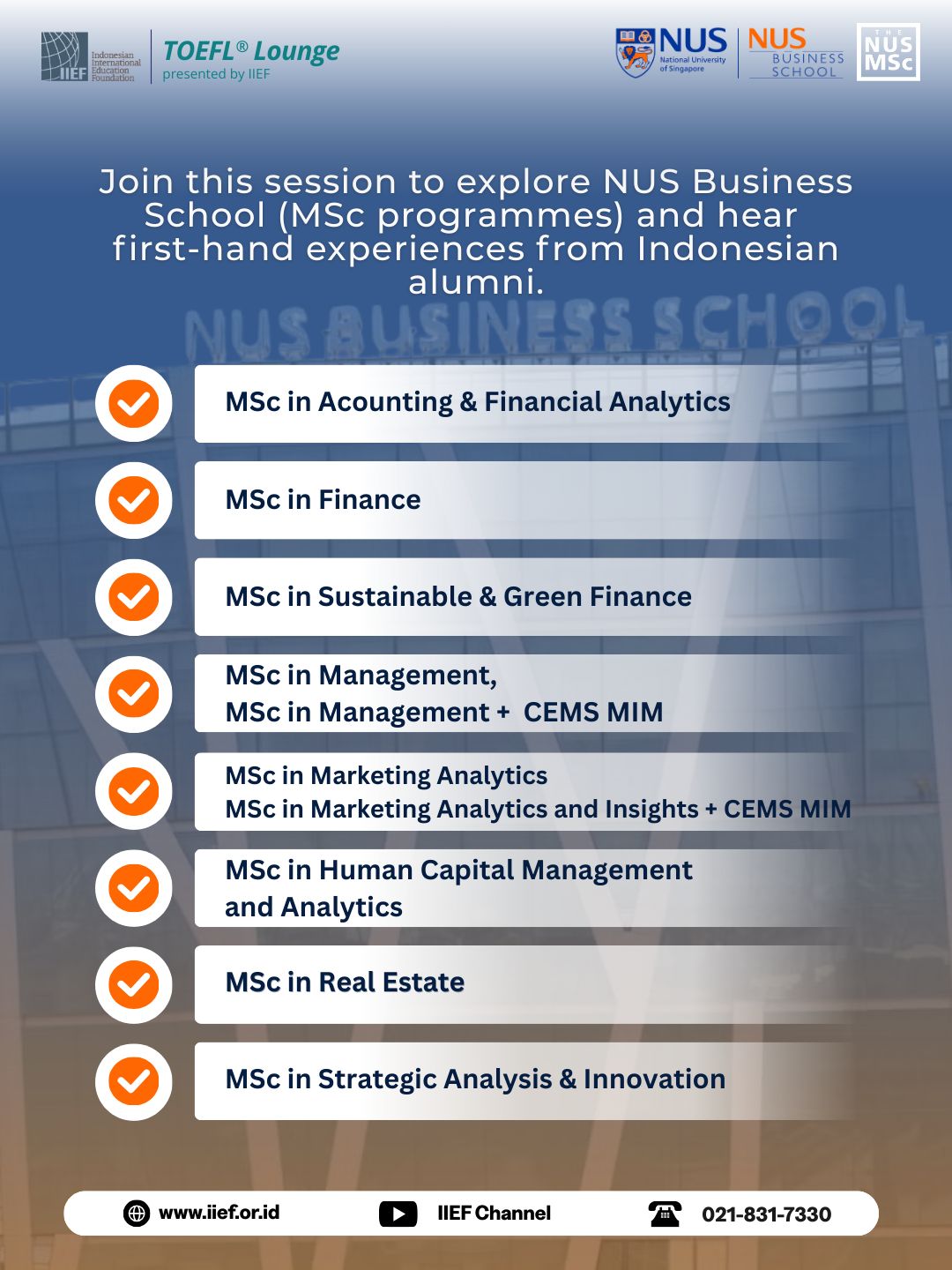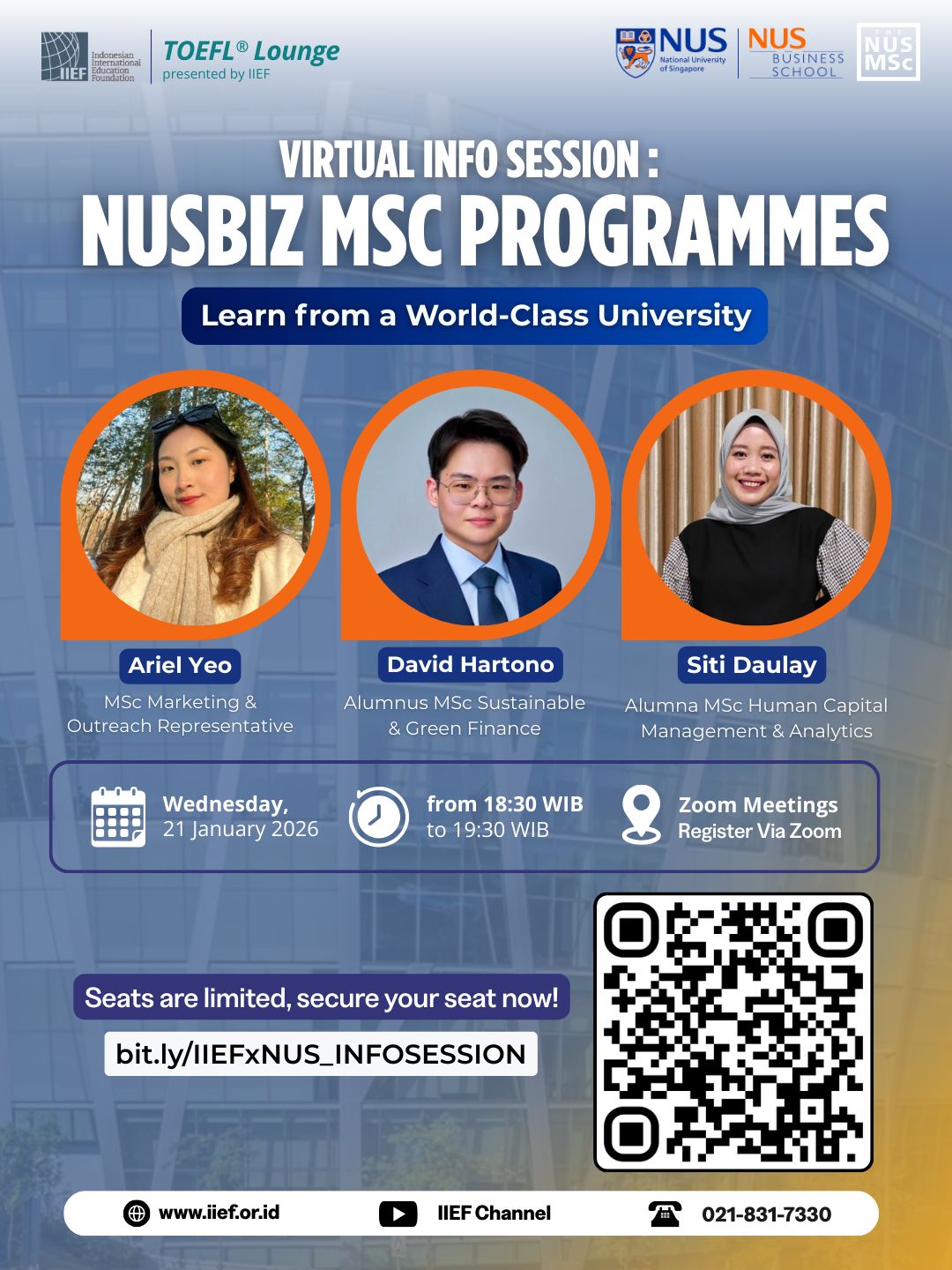 IIEF x NUS Business School: Virtual Info Session IIEF – Indonesia International Education Foundation bersama dengan NUS Business School (Peringkat 1 QS World University Rankings Asia 2019–2025) mengundang kamu untuk bergabung dalam Virtual Info Session seputar program MSc dan kehidupan mahasiswa di NUS.